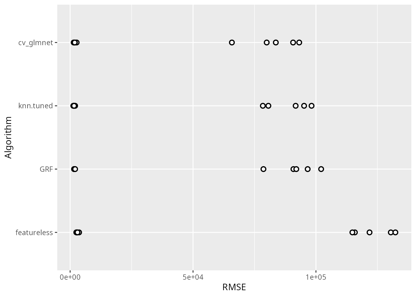 )As mentionned before, we are comparing four learners: our GRF, a Featureless model, a Linear Model (CV_Glmnet) and a tuned KNN.